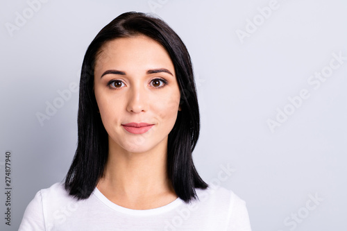 Close up photo beautiful amazing she her lady ideal plump lips sincere kind self-confident easy-going listening great good news wear casual white t-shirt isolated bright grey background