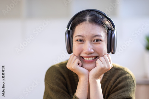 Close up photo of young Asian pretty cute nice Thai girl listening music headphones wireless dreamy empty space shopping offer