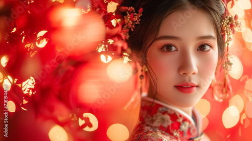 Close up portrait asian chinese woman in traditional cheongsam qipao dress on blurred red lantern background. Chinese new year. Generated AI.