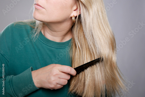 Close up portrait of a caucasian woman brushing her blonde hair with a black comb