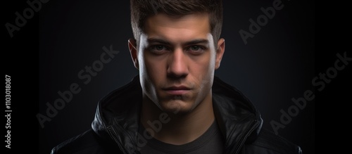 Close up portrait of a serious young man in a black jacket gazing at the camera against a dark background showcasing human emotions and feelings