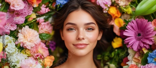 Close up portrait of a woman surrounded by colorful flowers with a blank space for text suitable for marketing or social media use