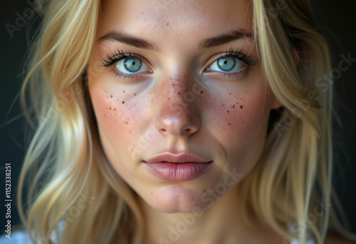 woman, portrait, face, eye, blue eye, freckle, blonde hair, skin, beauty, model, female, pretty, attractive, closeup, natural, make-up, soft, gentle, delicate, innocence, feminine, head shot, studio shot, light, shadow, sharpened, detail, healthy, glow, natural beauty, young adult, caucasian