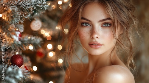 woman, portrait, young, freckle, christmas tree, festive, bokeh, female, girl, beautiful, attractive, model, face, skin, eye, hair, glowing, serene, natural beauty, christmas, holiday, winter, christmas, celebration, season, light, ornament, snow, frost, pine, evergreen, sparkle, warm, cosy, glistering, closeup, indoor, charme, elegance