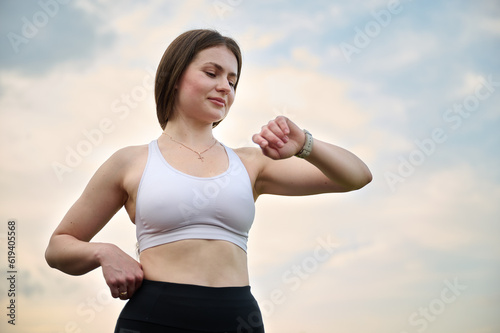 Close up portrait of active attractive beautiful strong female with smartwatch on hand monitoring heart rate after running. Caucasian female jogger runner running on jogging track. Sport and health.