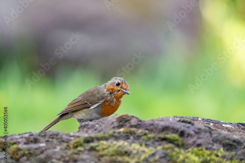 Close up portrait of an European robin on a wood trunk in a forest during summer