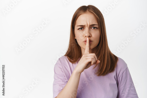 Close up portrait of angry girl hushing, frowning upset and shushing, shhh gesture, tell to keep quiet, scolding loud person, standing against white background