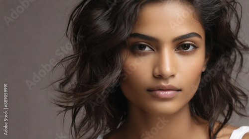 Close up portrait of beautiful Indian female model in 20s with perfect glowy skin