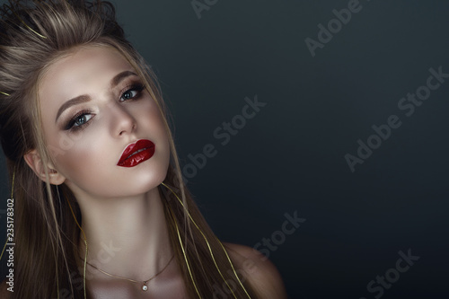 Close up portrait of beautiful young blond model with perfect provocative make up and stylish hairstyle decorated with golden strips. Isolated on grey background. Text sp
