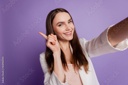 Close up portrait of cheerful lady hold camera indicate finger up wear formal suit posing on violet wall