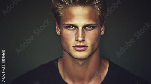 man, male, portrait, model, photogenic, blond, blond, hair, blue eye, eye, face, closeup, intense, gaze, expression, confident, young, adult, skin, tan, fashion, photo, studio, head shot, attractive, stylish, person, human, guy, look, serious, elegant, masculine, beauty, aesthetic, charming, dreamy, people, dark, man, head, casual attire