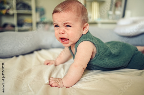 Close up portrait of little funny cute blonde infant boy child toddler with blue eyes in green linen bodysuit crying indoors at nursery room. Childish tantrum. Difficulty problems putting baby to bed