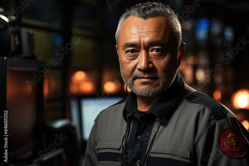 Close up portrait of mature asian male security guard in surveillance room.