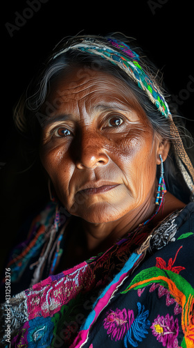 closeup, portrait, indigenous, mexican, woman, mature, tradition, dress, headscarf, shawl, intense, gaze, isolated, black background, female, colourful, culture, heritage, artistry, vibrant, ethnic, texture, detailed, feature, expression, look, eye, serious, identity, face, person, elderly, 1, hair, head, closeup, senior, black, looking