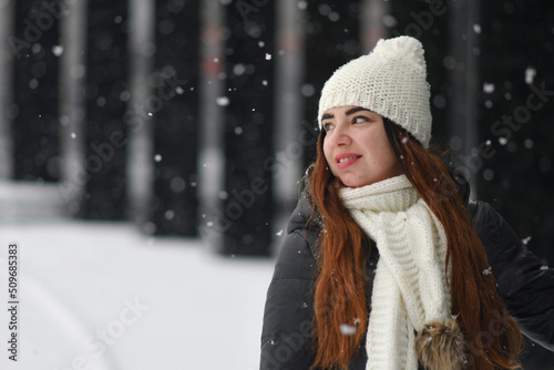 Close up portrait of romantic caucasian woman with ginger hair at winter snowfall. Copy space.