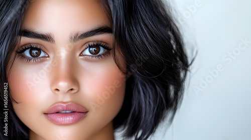 Close up portrait of young Asian woman with natural makeup, glowing skin, pink lips and dark wavy hair against light background, beauty and cosmetics concept.