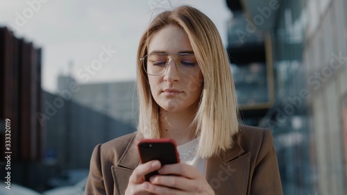 Close up portrait of young european blonde hair business woman using modern smart phone stay near business building professional female employer typing text message on cellphone outside spring