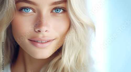 Close up portrait of young woman with long blonde hair and blue eyes. Skin care beauty, skincare cosmetics.