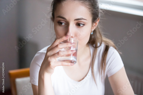 Close up portrait pensive serious millennial woman holding glass drink still water. Beautiful healthy pensive female on diet starting day with fresh natural water healthy lifestyle good habit concept