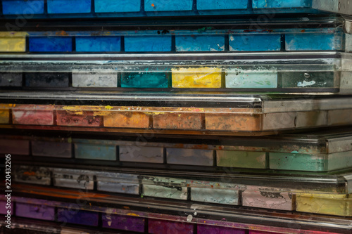 Close up Poster color tray, Poster color, Stacked color tray.