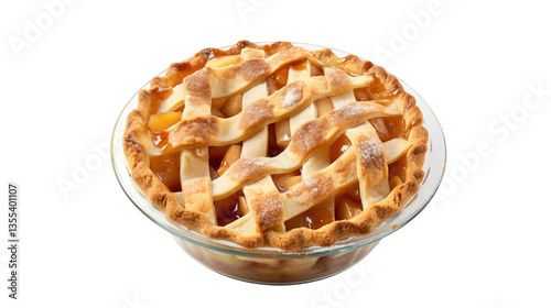 Close up shot of a homemade apple pie with a lattice crust in a glass pie dish on black backgroundisolated on transparent background