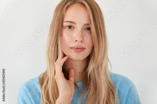 closeup, hair, tenderness, sweater, confidence, wall, view, woman, background, horizontal, female, 1, skin, beauty, face, tender, casual attire, indoor, youth, calm, blue, healthy, portrait, friendly, blond, facial, good-looking, person, student, appearance, stylish, young, caucasian, studio, adorable, cute, thoughtful, isolated, photo, shot, serious, pure, trendy, confident, appealing, lovely, european, skincare, beautiful, image