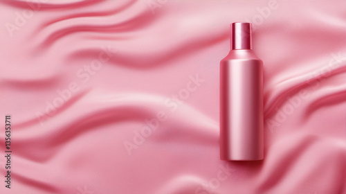 close up shot of matte pink bottle on soft pink silk background, evoking sense of elegance and luxury