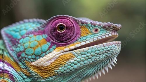 Close up side profile of a vibrant chameleon with striking purple and blue eyes and colorful scales