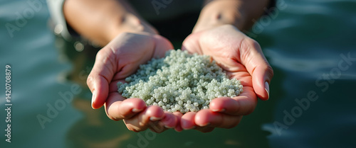 Close Up Side Shot of Microplastics on Hands Illustrating Water Pollution, Climate Change Effects on Marine Life, and Environmental Impact - Photo Stock Concept with Empty Space