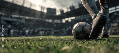 Close up soccer player's leg standing on football on field, wide angle shot, stadium atmosphere, realistic daylight