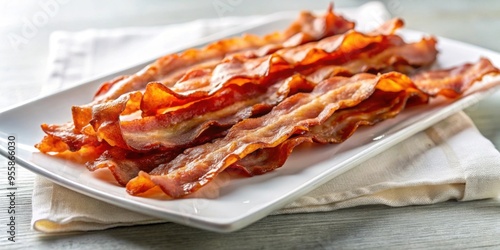 Close up studio shot of crispy bacon strips on a white dish with a paper towel, cooked, bacon, crispy, strips, dish
