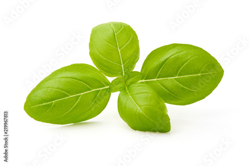 Close up studio shot of fresh green basil herb leaves isolated on white background.
