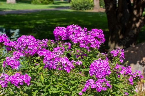 Close up texture view of a sunny garden of bright purple garden phlox (phlox paniculata)