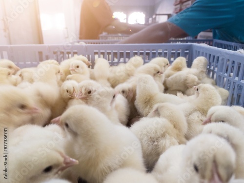 Close up the new born chickens on the basket pullchick activity on farm hatchery production.