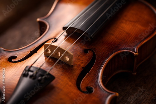 Close up view of a classical violin showing elegant wooden texture and strings.