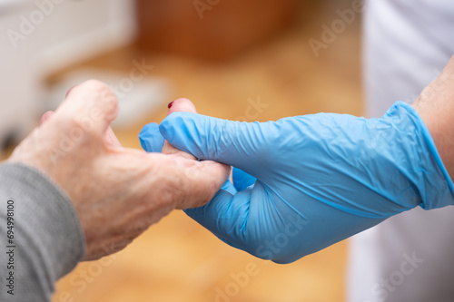 Close up view of a Doctor using glucosmeter, checking blood sugar level from senior patient hand. High quality photography