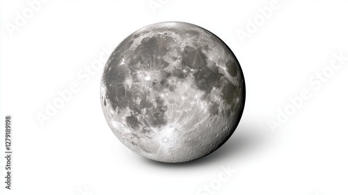 Close up view of a grayscale moon, exhibiting a detailed surface texture with craters and dark maria against a white background. A subtle shadow is