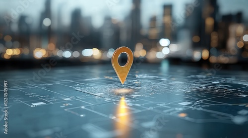 Close up view of a navigation pin precisely positioned on a detailed map of a bustling urban skyline providing directional guidance and location insights