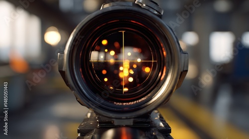 Close up view of a rifle scope lens with crosshairs targeting blurry orange lights
