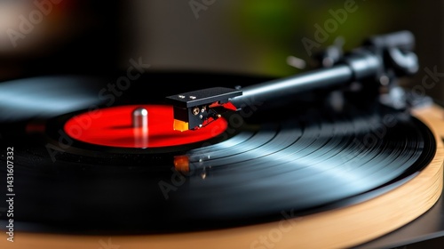 Close up view of a turntable needle playing a vinyl record with a red label. The image shows the needle and the grooves of the record in detail, highlighting the texture and color contrast.