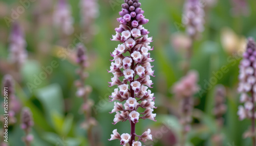 Close up view of beautiful flowering plant with delicate purple blossoms, showcasing intricate details and vibrant colors against soft green background. floral arrangement creates serene