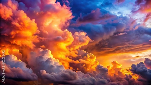 Close up view of colorful dramatic cumulus fluffy clouds against a blue sky at sunset , clouds, cumulus, dramatic, colorful