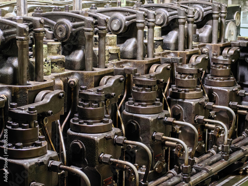Close up view of fuel pumps of old 6 cylinder diesel engine