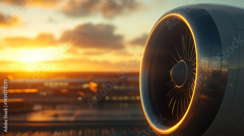 close up view of jet engine at sunset, showcasing intricate details of turbine and warm glow of evening light. airport background adds to travel ambiance