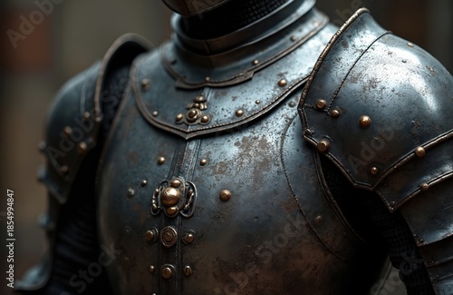 Close up view of medieval knight armor chest plate. Detailed steel protection with rivets, ornate engravings and buckles. Dark historical warrior suit metal surface.