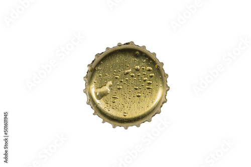Close up view of metal cap with drops isolated on white background.