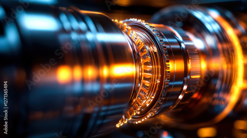 close up view of metallic mechanical component with glowing elements, showcasing intricate details and reflections