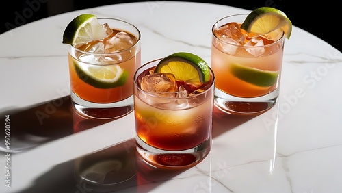 Close up view of refreshing sour alcohol cocktails with lime and ice on tabletop on white