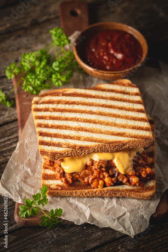 Close up view of tasty sloppy joe sandwich with ground meat, sauce and cheese on wooden background