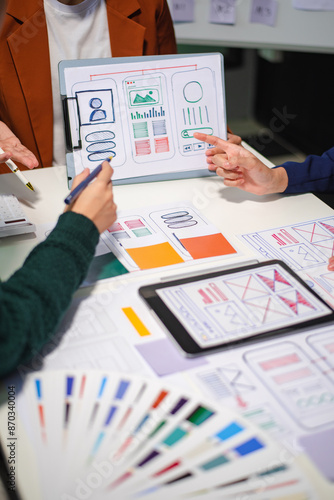 Close up view of UI developer team brainstorming on their project with laptop, smartphone and digital tablet.